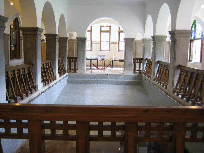 下圖即是位於樓下當年的洗浴池,地面呈現傾斜狀,方便浴客入池,浴池長約9米 ,寬6米 ,最深約1米 四,現在看起來覺得空間並不大。主要以服務男賓為主,另有獨立浴室供貴賓使用。
