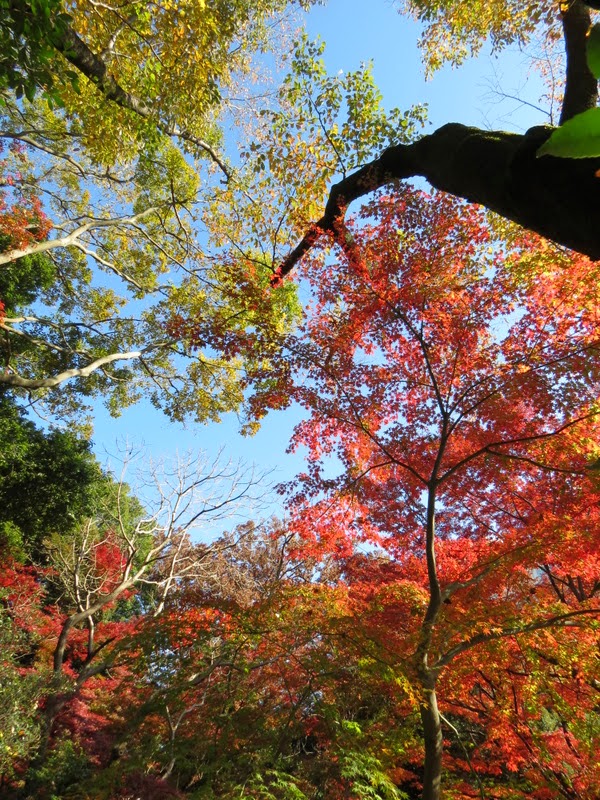 接著一入門迎面是一片色彩繽紛的楓樹林,放眼望去淺綠、深綠、杏黃、粉紅乃至艷紅的樹姿互相疊合交錯,美不勝收,直如人間仙境,讓人停步徘徊,不忍驟離。可惜的是參觀當天天氣陰雨,陽光不顯,若得冬日斜陽自樹頂傾瀉映照,光彩搖曳樹影婆娑,其景必更為迷人。