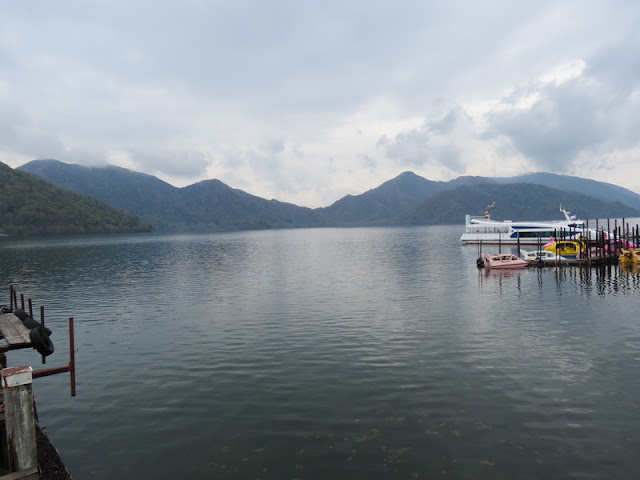 中午巴士開到中禪寺湖,我們在湖畔的餐廳吃午餐,食物也就是一般的日式冷餐盒,但天婦羅部分則是現場製作供應的,還有熱湯。餐廳臨窗座位的景觀不錯,一面觀賞湖景,一面在細雨微寒中享用美食。讓人心生一種愜意旅行的閒適享受。